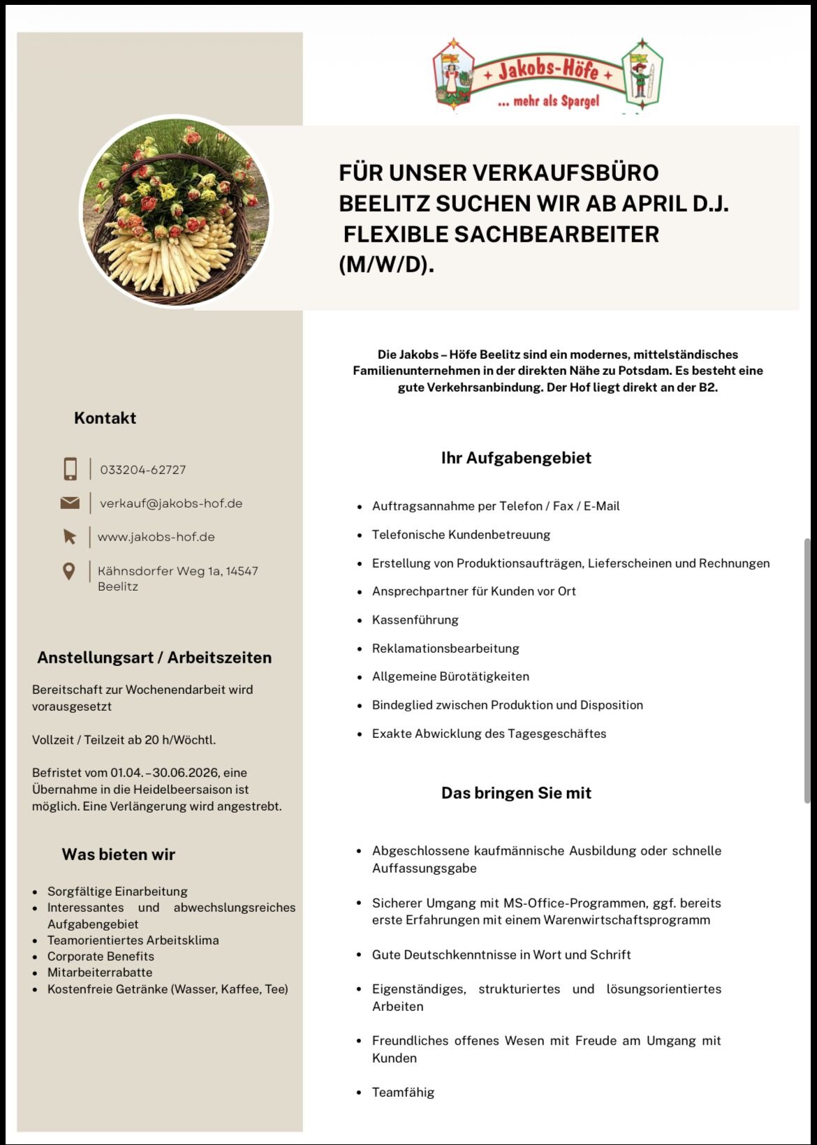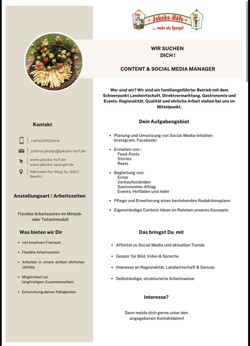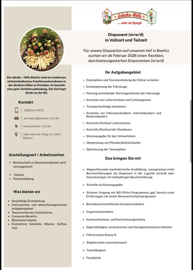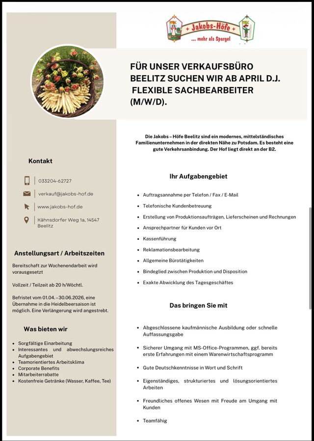 Standverkäufer für unsere Spargelstände im Raum Berlin, Potsdam und Umgebung (gerne auch Rentner)
