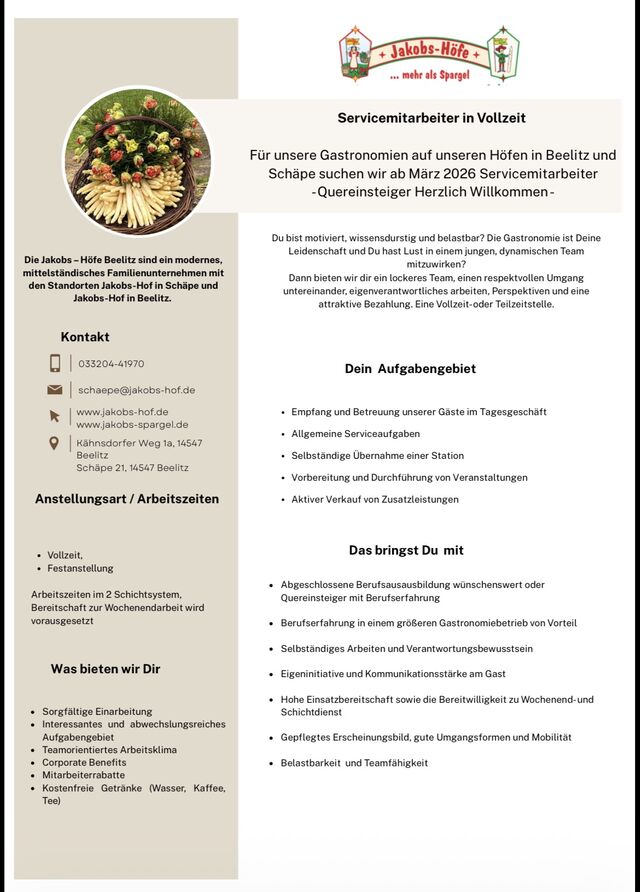 für unsere Standorte in Beelitz und Schäpe - auch als Quereinsteiger möglich -