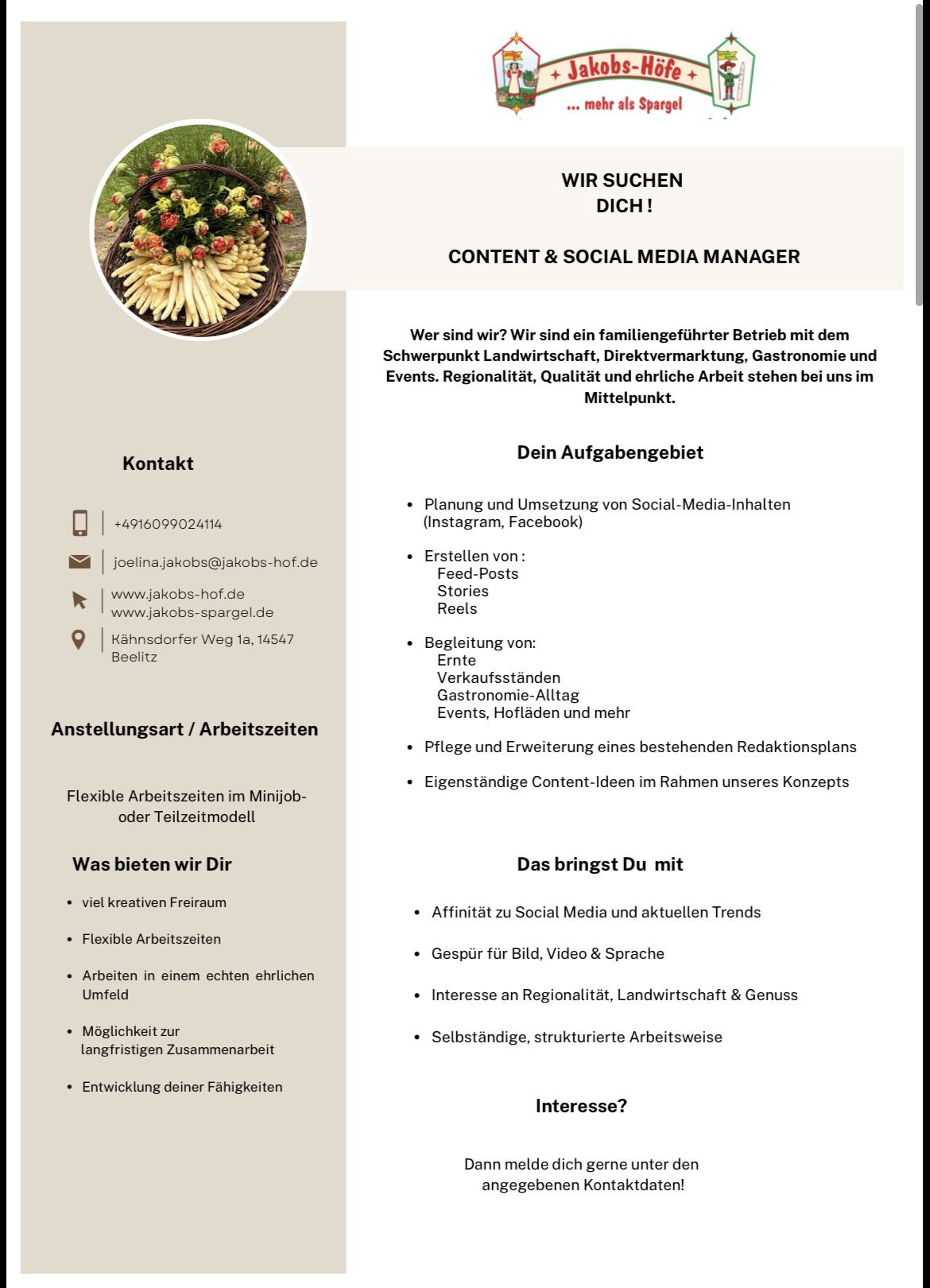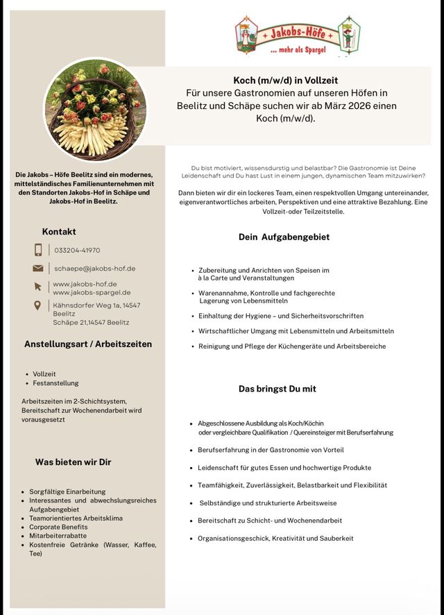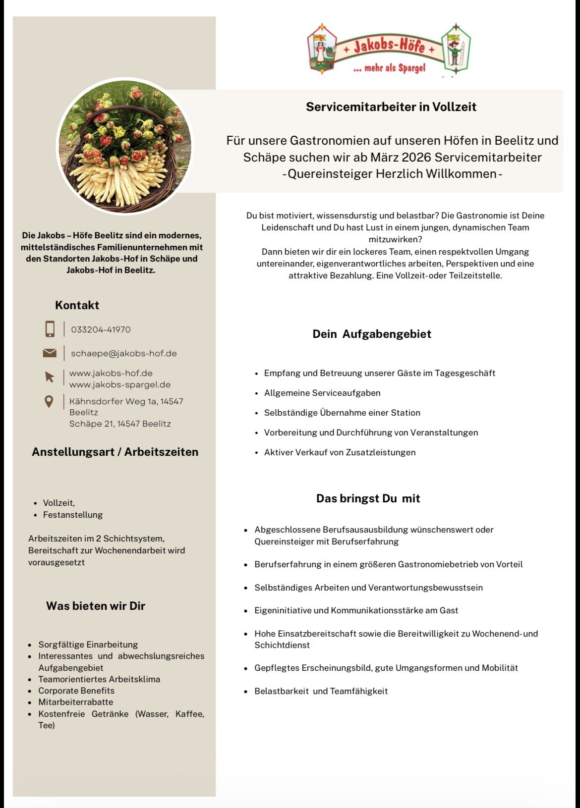 Die Jakobs-Höfe mit ihren Standorten in Beelitz und Schäpe - nur einen „Katzensprung“ von Berlin entfernt und eingebettet ins Beelitzer Spargelanbaugebiet - bieten ihren Besuchern regionale Küche, eigene Produkte im Hofladen bis hin zum Spielplatz mit Streichelzoo für die Kleinsten. Ob der romantische Vierseithof in Schäpe mit Bauernscheune & dem dazugehörigen Landmotel oder die große Festscheune mit Sonnenterrasse in Beelitz bieten für jeden Anlass die passende Location. Besuchen Sie die Höfe und nehmen sie ein Stück „… mehr als Spargel“ mit nach Hause.