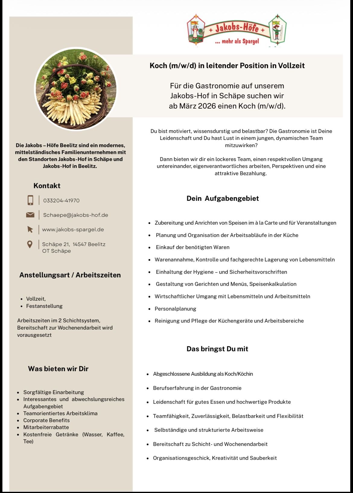Der Jakobs Hof Beelitz – Ideal für die ganze Familie bietet der Hof eine Festscheune mit großer Sonnenterasse, das Restaurant „Jakobs Stuben“, den Landladen und für die Kleinsten Spielplatz und Streichelzoo. Von März – Dezember gibt es regionale Küche und saisonale Produkte