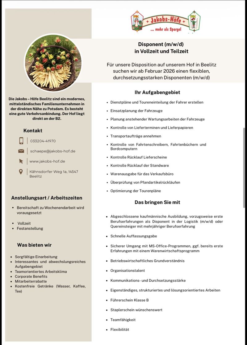 für unsere Standorte in Beelitz und Schäpe - auch als Quereinsteiger möglich -